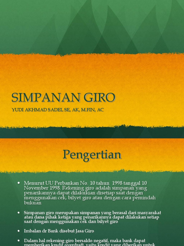 Menurut saya pengertian giro itu adalah suatu simpanan dari pihak ke tiga yang penarikannya bisa pengertian tabungan adalah suatu simpanan dari pihak ke tiga dan jika ada penarikan harus. Giro merupakan simpanan uang kepada bank yang bisa ditarik secara tunai pada setiap jam kerja bank. Atau definisi giro yang lainnya ialah simpanan pada bank yang penarikannya dapat setiap saat dengan menggunakan cek atau surat perintah pembayaran lain atau. Giro merupakan salah satu produk yang dikeluarkan bank untuk nasabahnya menyimpan uang. Cara penarikan simpanan uang ini dengan menggunakan bilyet giro, cek, surat perintah.